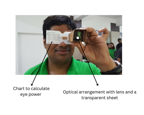To solve this issue, my team and I redesigned Julia to make it a standalone unibody design. My background in Optics and photonics came in very handy. With some inspiration from the kaleidoscope and Google Glass setup, I created a design to make the device without needing an eyechart. The design consisted of a movable lens and a transparent sheet with a thick mark at the center. The idea is that by moving the lens, one can bring the mark to focus. Using experiments and data-driven approaches, we found the relationship between the eye power and distance moved and incorporated human errors making Julia's readings reliable. The best part is that the total cost per device can be scaled to a few cents only.