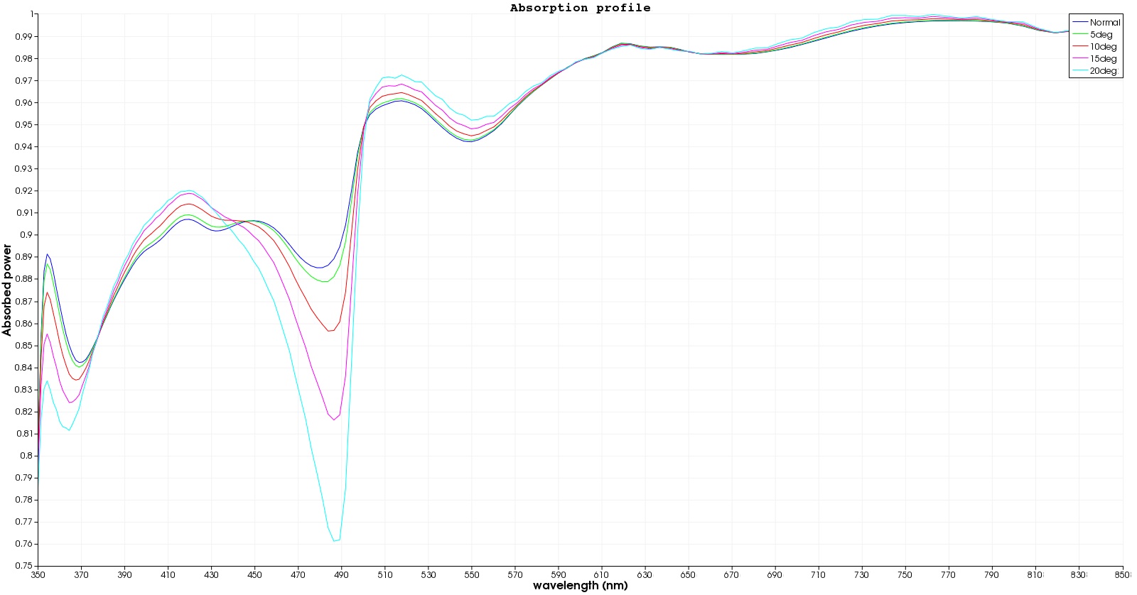 Performance of the optimised nanostructure design over diferrent angle in incidence